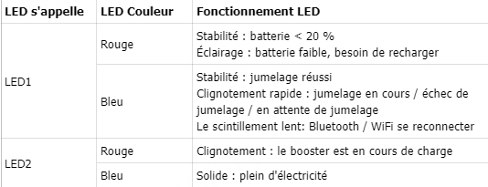 Il y a deux LED sur le booster. L'un est situé sur le dessus, un autre est sur le côté.Les fonctions sont répertoriées ci-dessous.